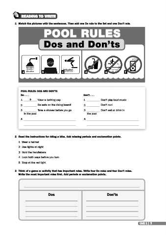 3 Think of a game or activity that has important rules. Write four Do rules and four Don’t rules.