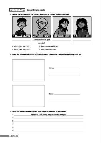 2 Draw two people in the boxes. Give them names. Then write a sentence describing each one.